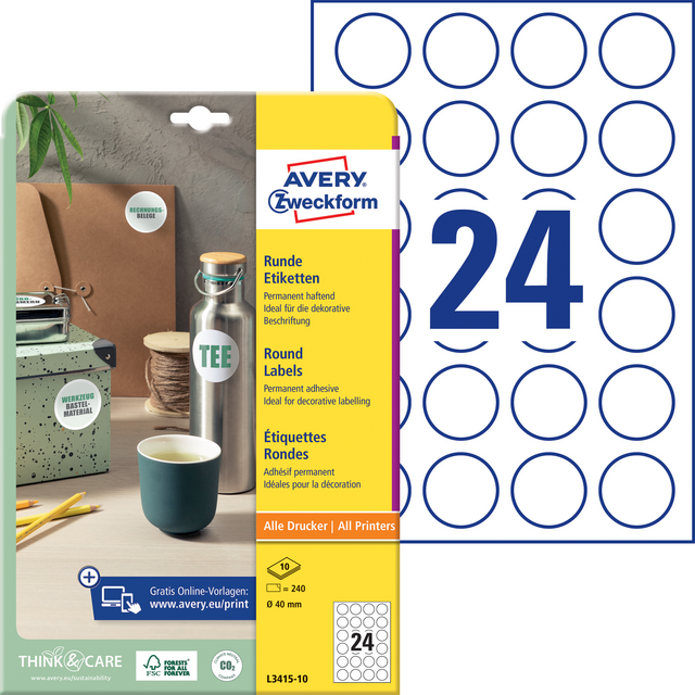 Etiket Avery Zweckform L3415-10 rond 40mm wit 240stuks
