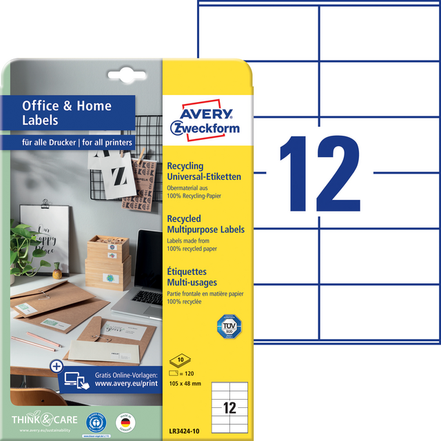 Eigenschappen "Etiket Avery Zweckform LR3424-10 105x48mm recycled wit 120stuks"