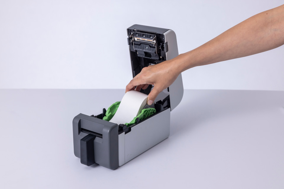 Productinformatie "TD-2350DFC203 Professionele linerless labelprinter (wit/grijs), Direct thermisch, LCD scherm, 39 tot 58mm labelbreedte, 203 dpi"