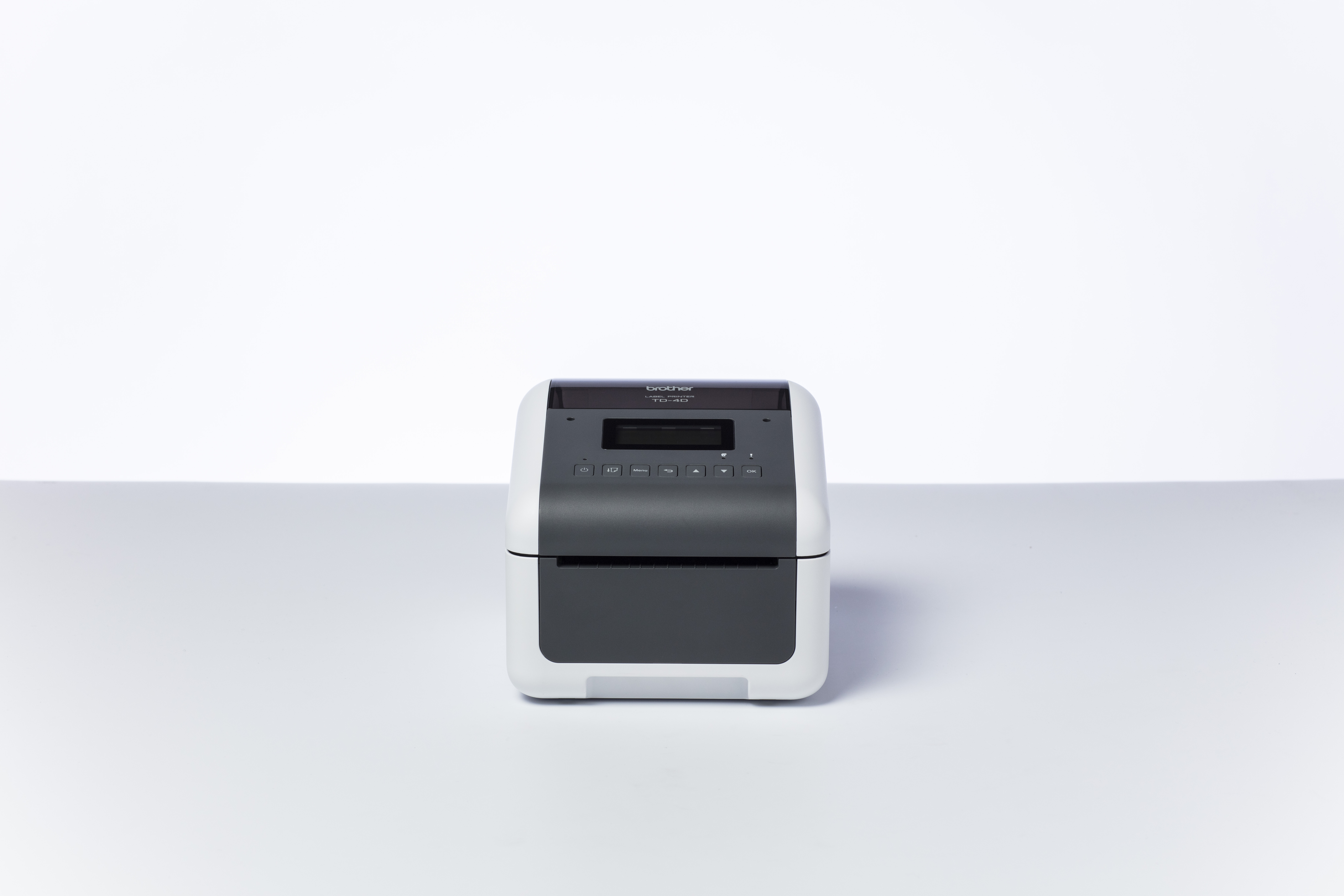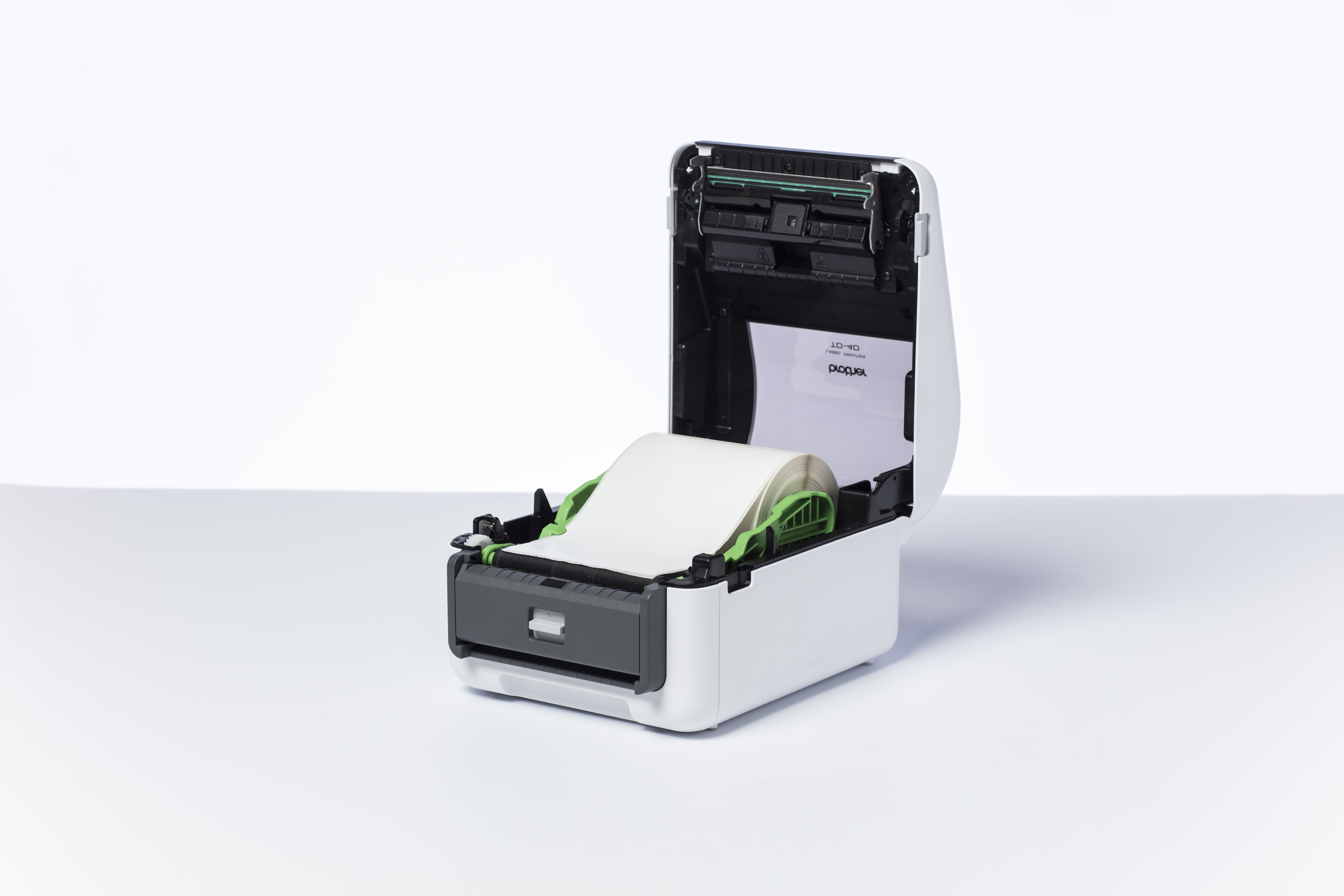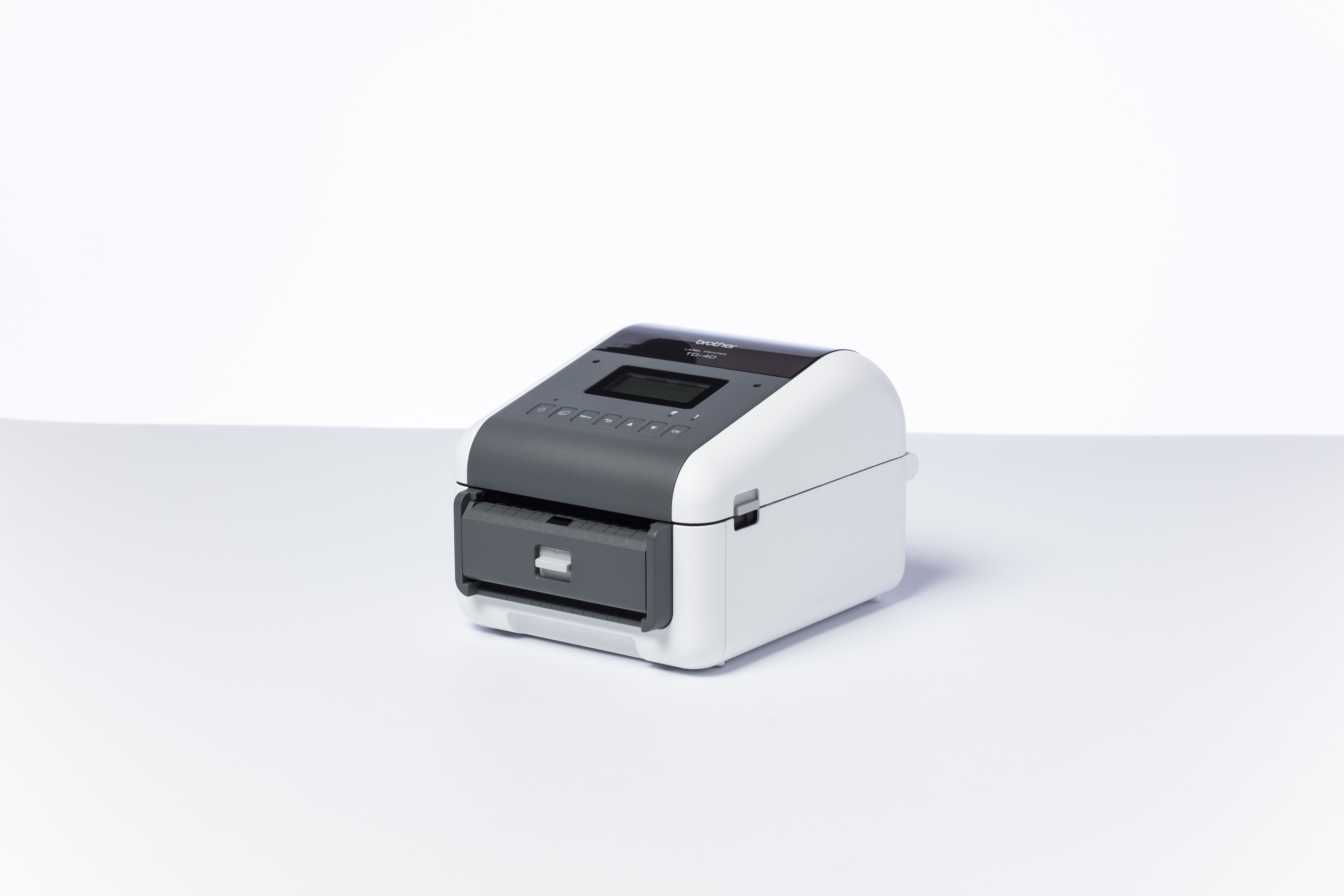 Professionele labelprinter (wit/grijs), Direct thermisch, 256MB RAM/64MB FLASH, LCD scherm, 19 tot 118 mm labelbreedte, 300 dpi, RD voorgestanste labels & RD doorlopende tape, USB, USB host, RS232-serieel, LAN/WLAN, Bluetooth, Mfi gecertificeerd, incl USB kabel