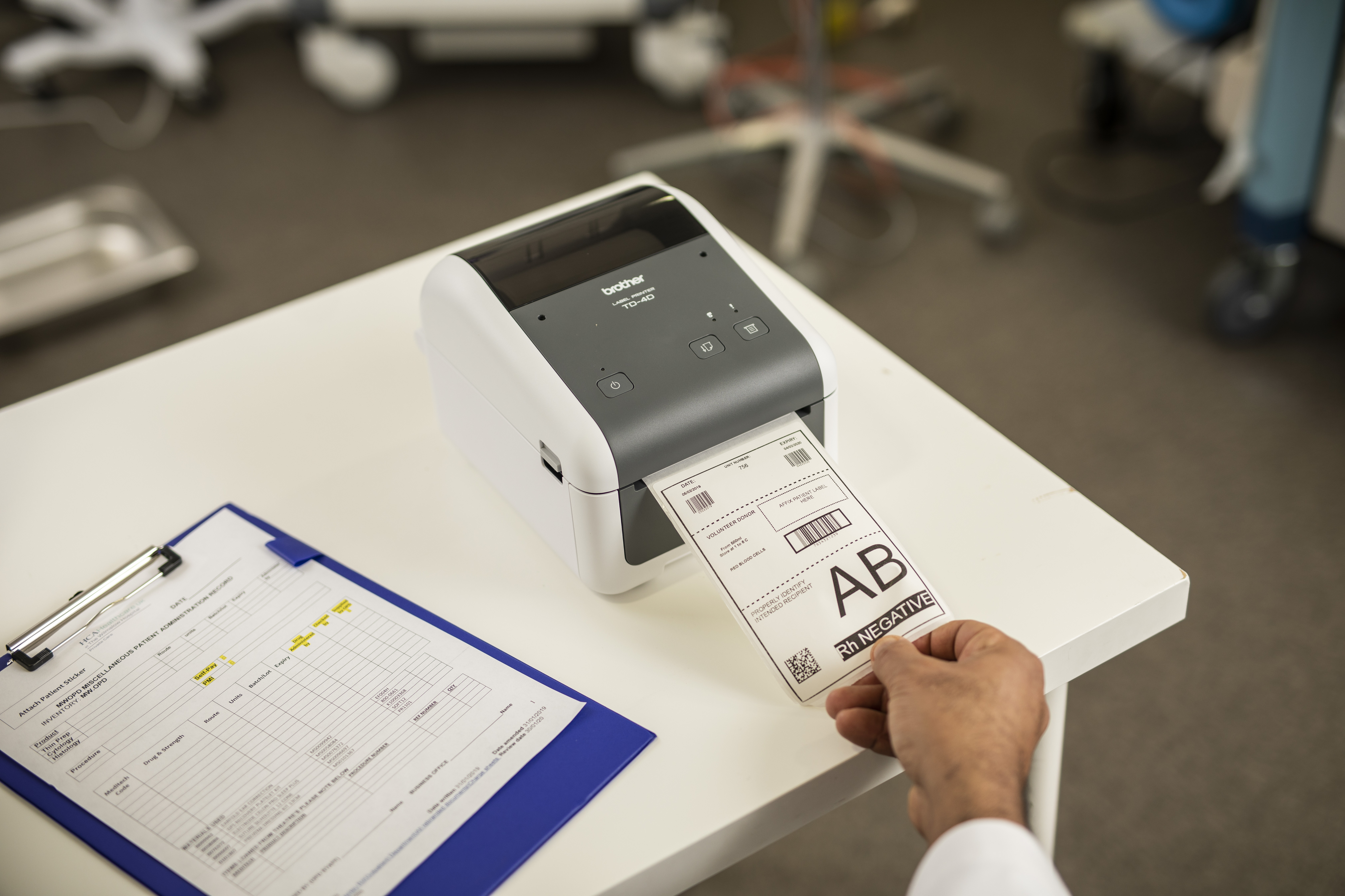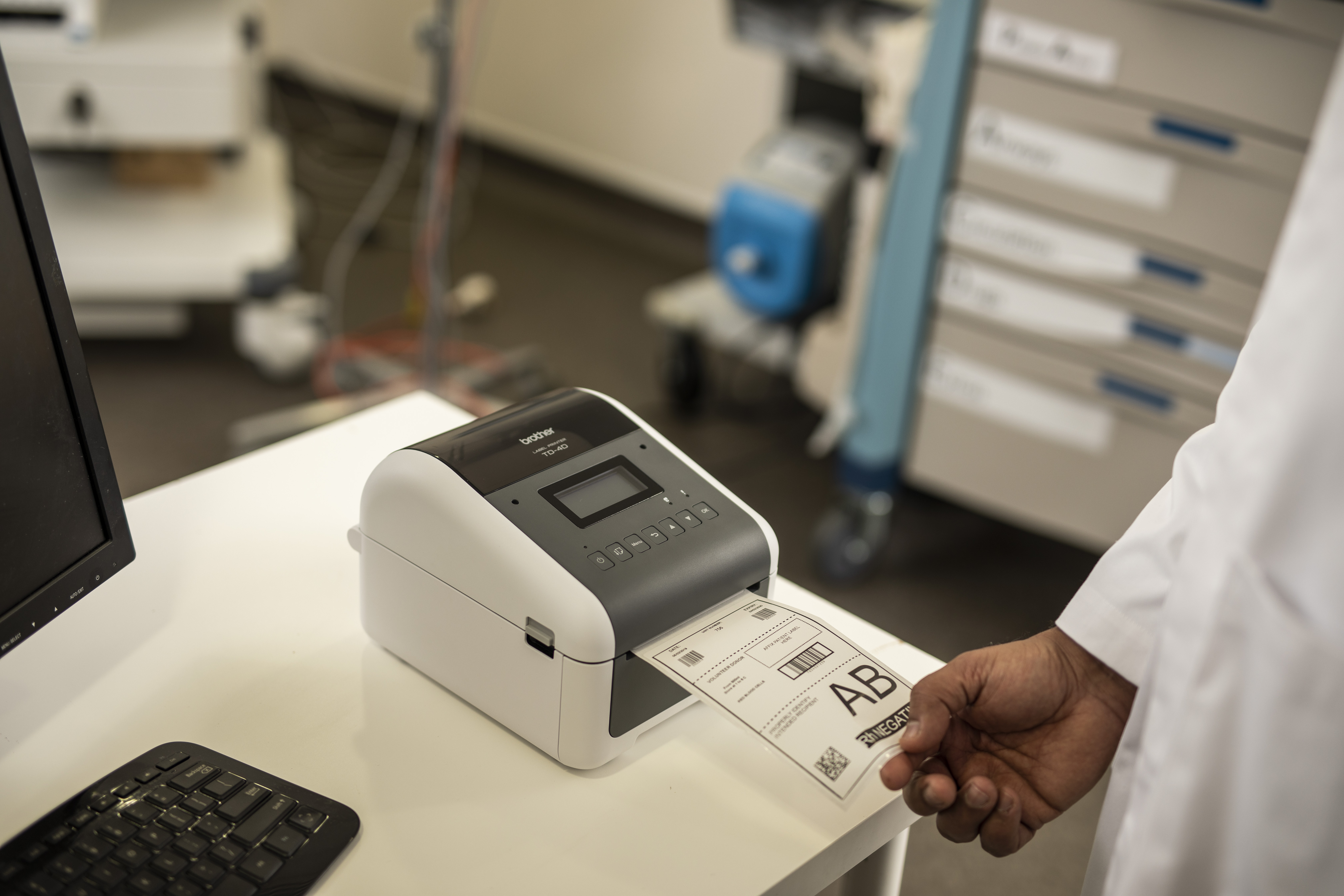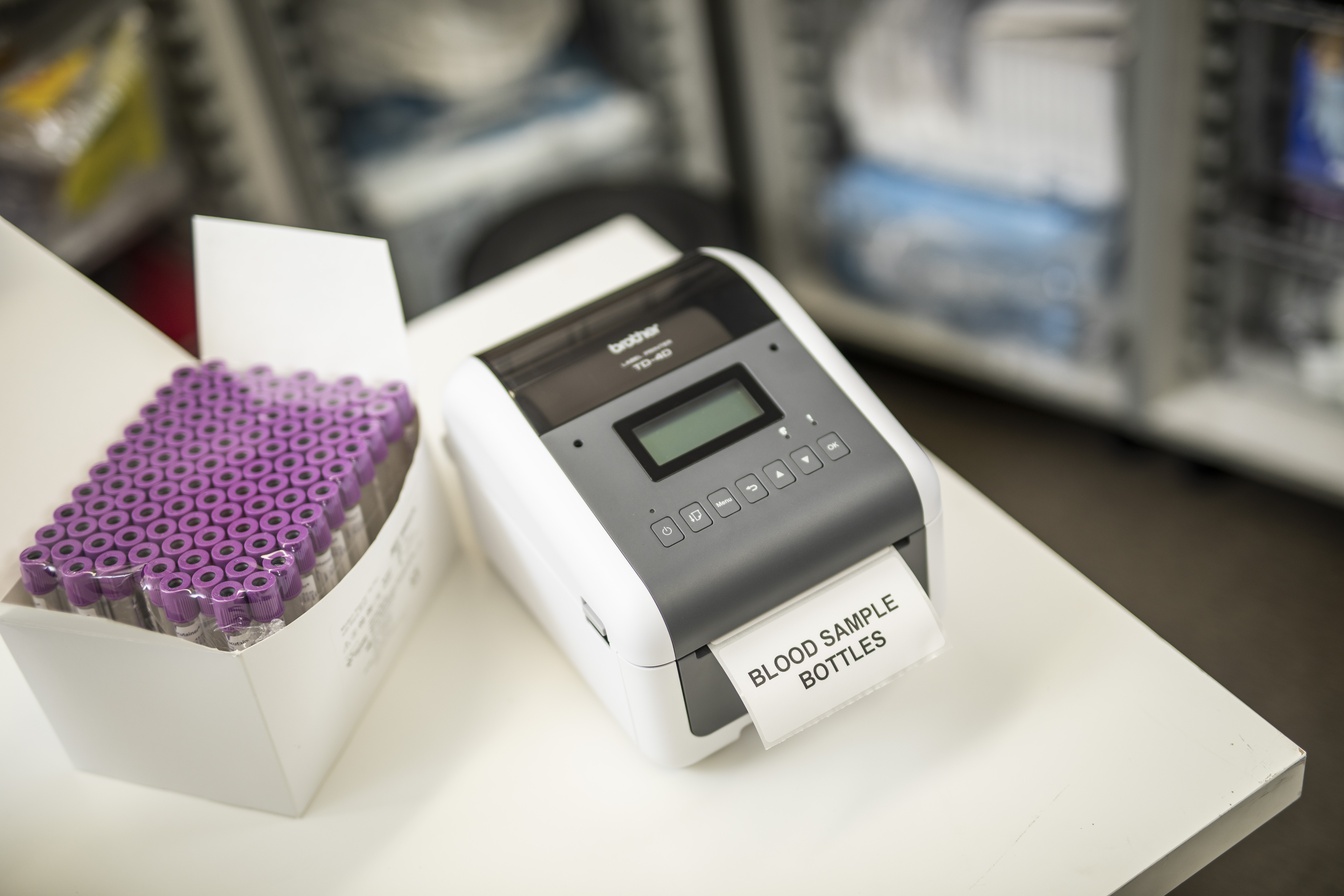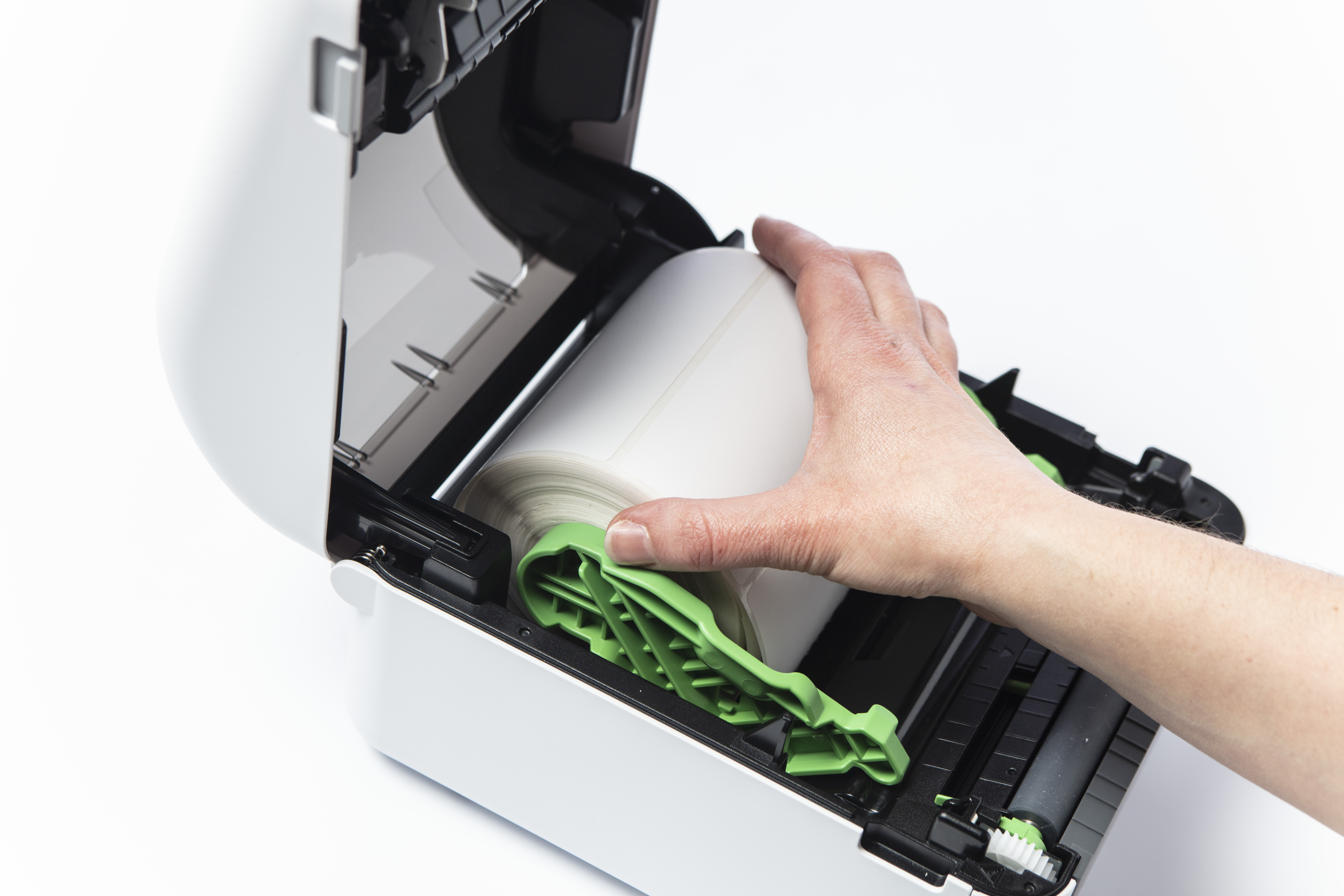 Professionele labelprinter (wit/grijs), Direct thermisch, 256MB RAM/64MB FLASH, LCD scherm, 19 tot 118 mm labelbreedte, 300 dpi, RD voorgestanste labels & RD doorlopende tape, USB, USB host, RS232-serieel, LAN/WLAN, Bluetooth, Mfi gecertificeerd, incl USB kabel