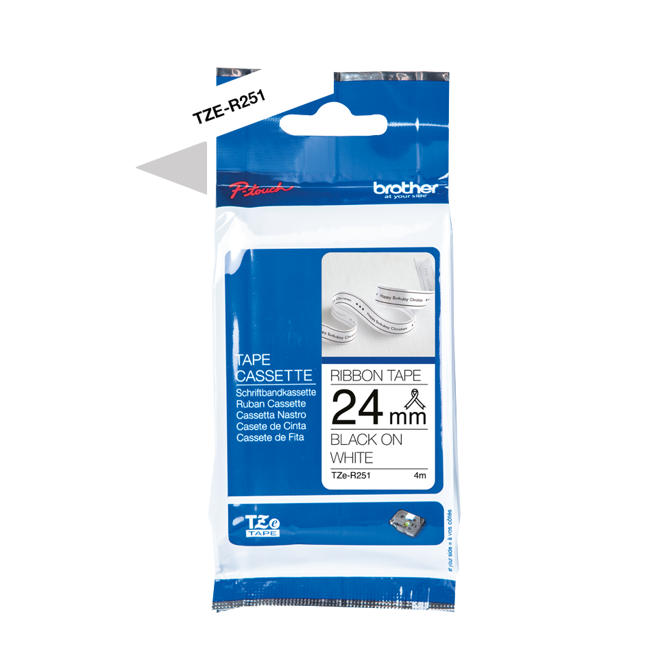 De Brother TZE-R251 cassette bevat een 24mm breed stoffen lint dat met een Brother P-touch labelmaker bedrukt kan worden. Zo maakt u fraaie versierde stoffen stroken.
