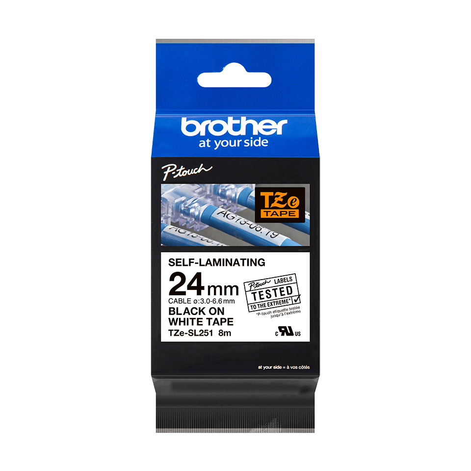 Brother TZe-SL251 zelflaminerende tape zwarte tekst op witte tape, 24mm is te gebruiken met een aantal P-touch modellen die geschikt zijn voor 24 mm en 36 mm TZe tapecassettes. Deze professionele tape is bedoeld voor datacom installateurs en heeft speciale kleef- en labeleigenschappen die ervoor zorgen dat de labels goed en stevig aan draden en netwerkkabels blijven zitten.