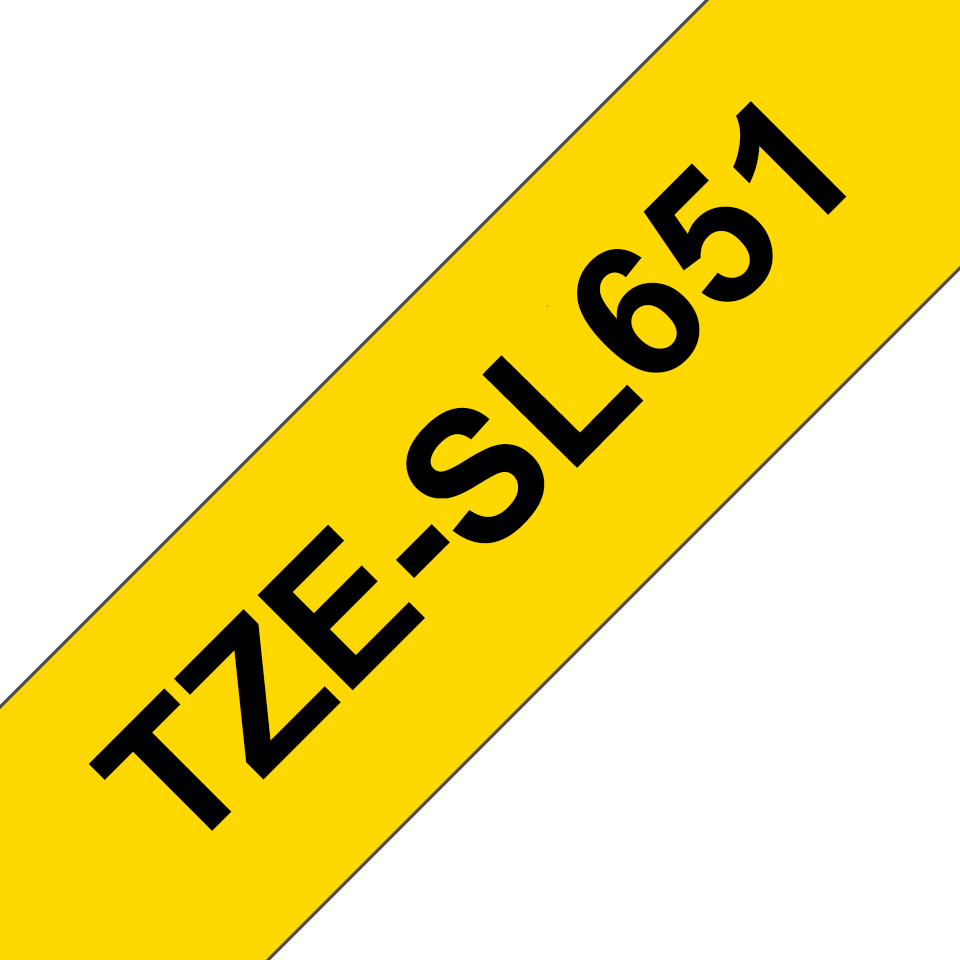 Brother TZe-SL651 zelflaminerende tape, zwarte letters op gele tape, 24mm is te gebruiken met een aantal P-touch modellen die geschikt zijn voor 24 mm en 36 mm TZe tapecassettes. Deze professionele tape is bedoeld voor datacom installateurs en heeft speciale kleef- en labeleigenschappen die ervoor zorgen dat de labels goed en stevig aan draden en netwerkkabels blijven zitten.