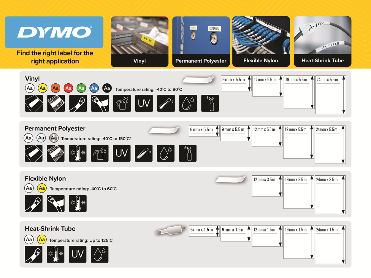 Het RHINO assortiment van DYMO® omvat een aantal intelligente printers met een groot assortiment sterke tapes en krimpkousen.