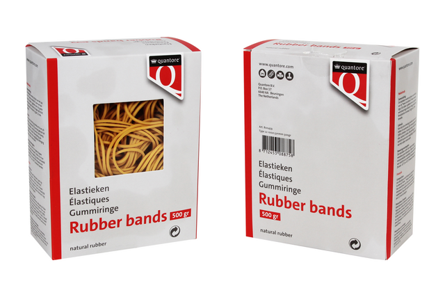 • De elastiekjes van Quantore zijn ideaal voor het bundelen, organiseren en samenhouden van diverse materialen op kantoor, thuis of op school. Deze bruine elastieken in maat 22 hebben een afmeting van 100x1,5x1mm en zijn gemaakt van 80% pararubber. Ze combineren stevigheid met een hoge elasticiteit, waardoor ze langdurig meegaan en niet snel scheuren. Geleverd in een doos van 500 gram, zodat je altijd voldoende voorraad hebt voor dagelijks gebruik.Kenmerken:
