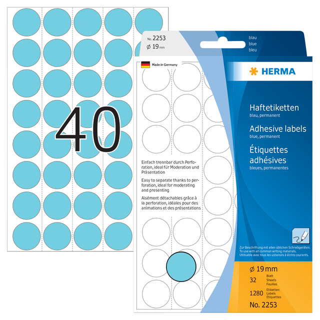 Eigenschappen "Etiket HERMA 2253 rond 19mm blauw 1280stuks"