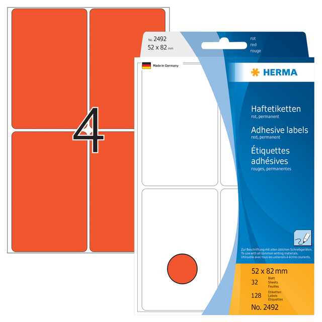 Eigenschappen "Etiket HERMA 2492 52x82mm rood 128 stuks"